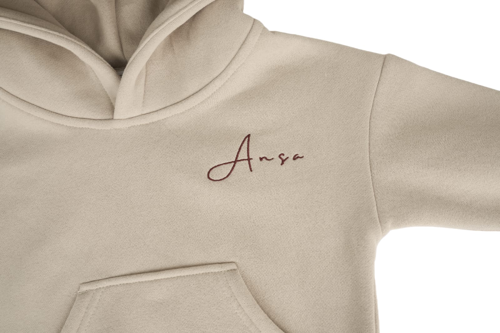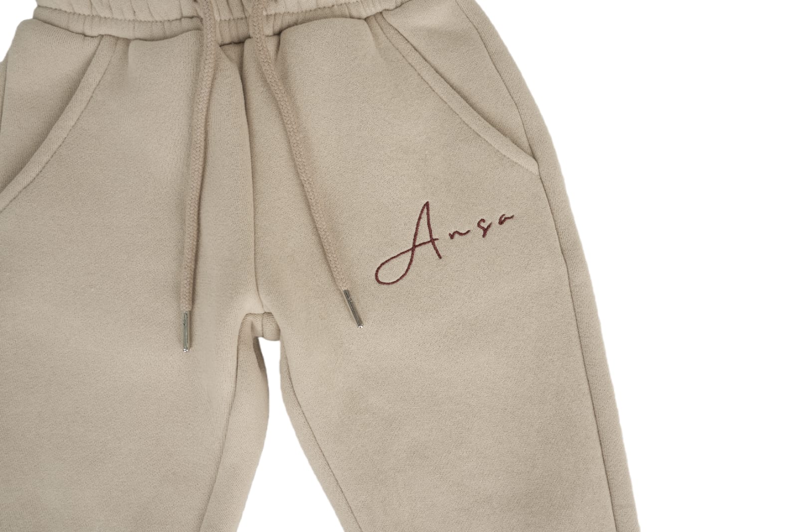 Het logo van Ansa aan de voorkant van de hoodie en de broek en de tekst achterop de hoodie zijn geborduurd.